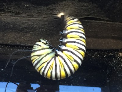 This monarch caterpillar is preparing to molt for its final stage, the pupa, or chrysalis stage--the final step before becoming a butterfly. It crawled up and attached itself to our classroom window!