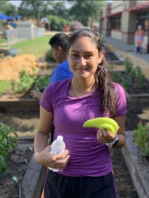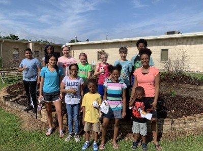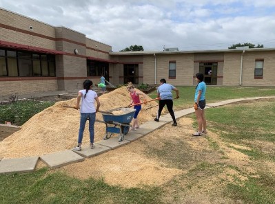 The Summer Garden Club broke a sweat while mulching around our raised beds.