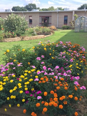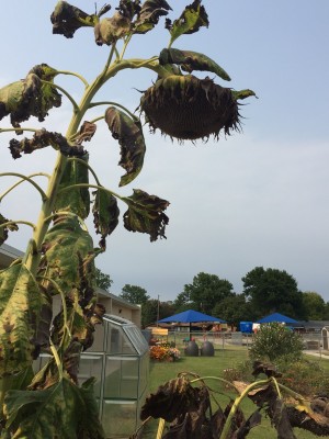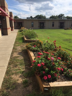 These are the 2nd through 6th grade garden beds. Flowers, milkweed, pumpkins and watermelon adorn these gardens.