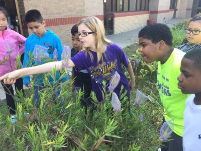 One of our Garden Experts points out our milkweed babies (monarch larvae!).