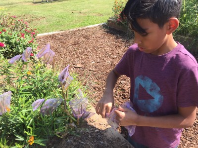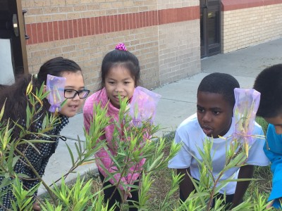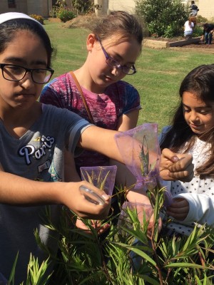Students place bags around milkweed pods in order to catch the seeds before the pods burst open and the wind scatters the feathery kernels.